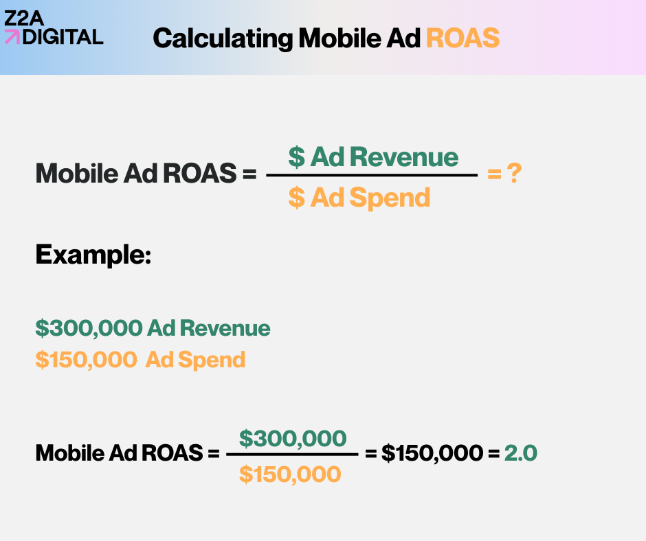 The formula for ROAS is total revenue from ads divided by ad spend. For mobile ad campaigns, it’s total mobile ad revenue divided by mobile ad cost. Here’s what it looks like visually: