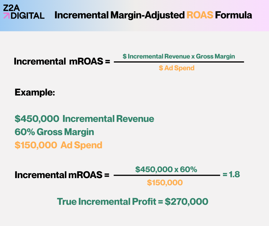 For true efficiency, you can measure for incremental margin-adjusted ROAS. This formula isolates causality (by incorporating incrementality data), helping you see a direct correlation between ad spend and raw, take-home revenue. The formula is as follows: total incremental revenue multiplied by gross margin divided by ad spend. Expressed visually, it looks like this: