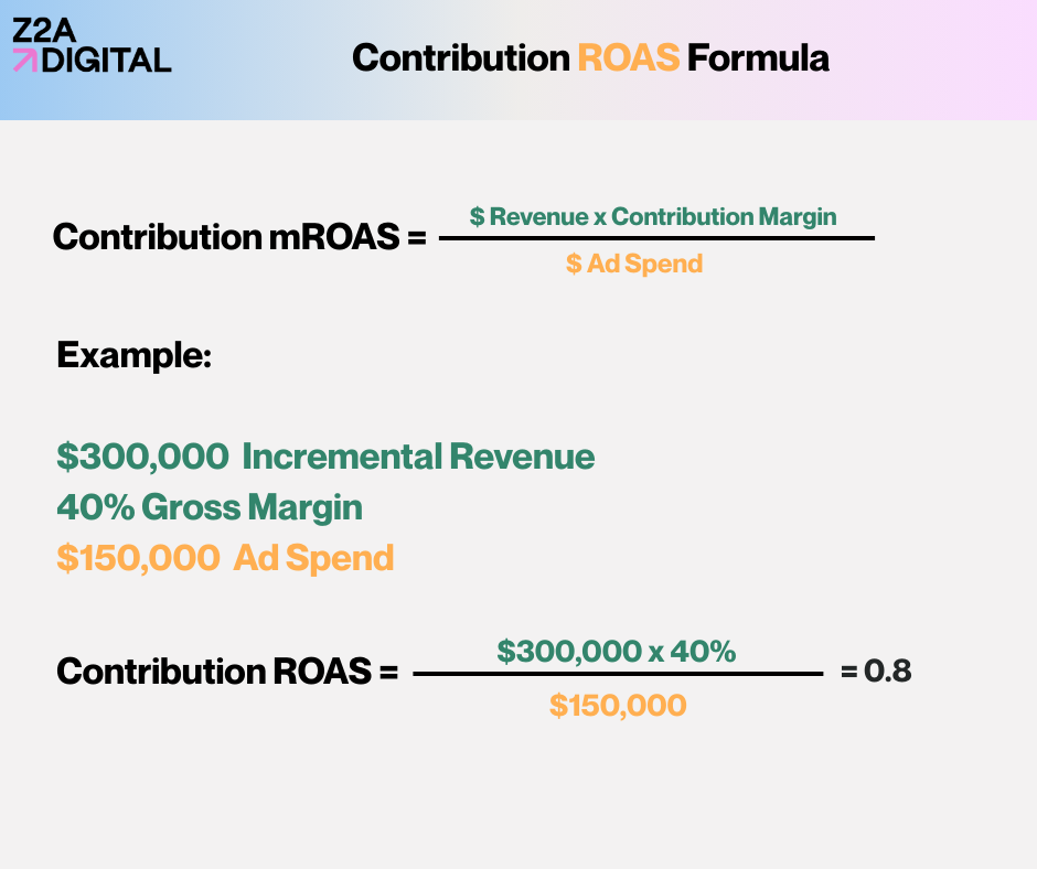 There’s also the contribution ROAS formula, which some teams use to understand when a channel funds its own operations. It looks like this: total revenue multiplied by contribution margin divided by ad spend.