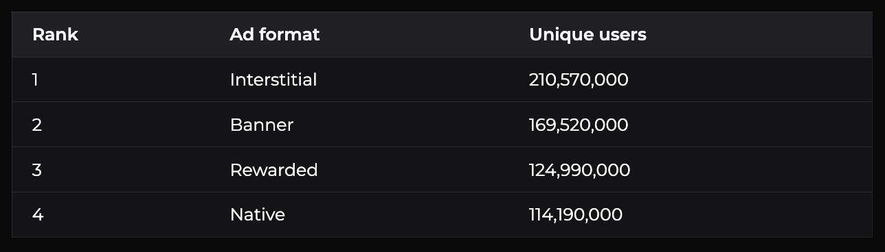 kAI: Here’s the comparison of ad formats by unique user reach for all Android apps in the United States over the last 30 days: