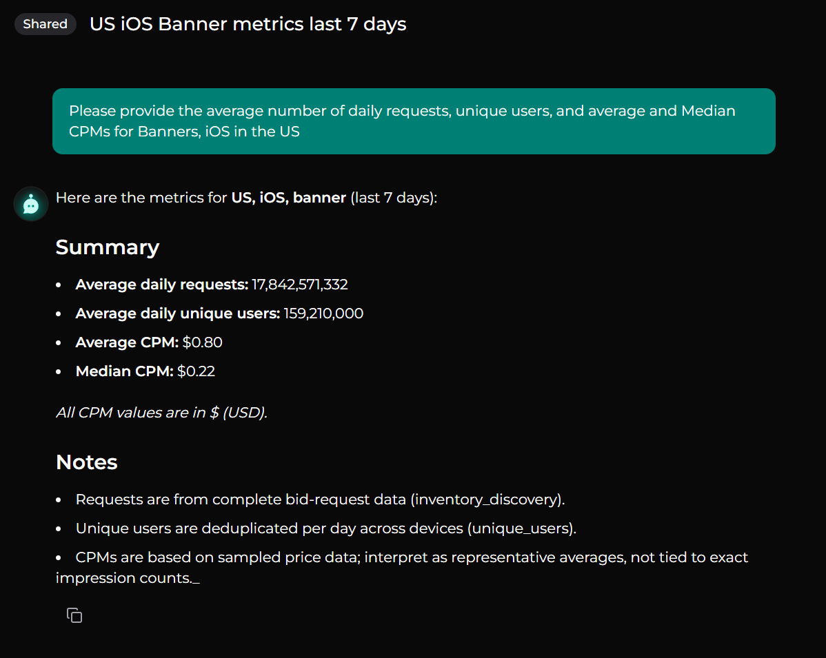kAI Explorer is Kayzen’s AI assistant for exploring mobile in-app inventory. It lets you pull insights from mobile programmatic inventories with the conversational ease of an LLM. Running on OpenAI’s GPT-5.1 and Google’s Gemini 2.5 Flash, you can ask simple questions and retrieve detailed data insights in natural language, in seconds. That includes queries about market prices, ad formats, and much more. Best of all, you don’t need to reference dashboards or wait for BI tickets.