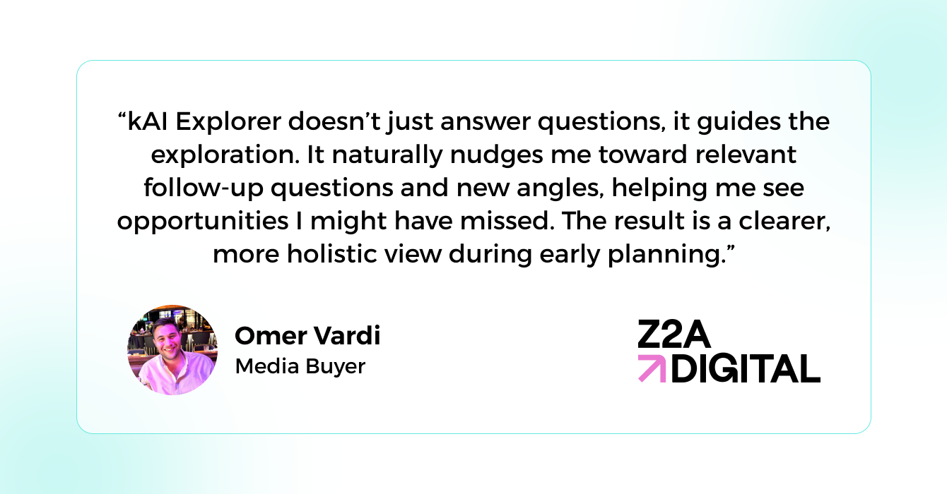 Being advocates of AI-streamlined workflows ourselves, Z2A Digital agree that kAI Explorer is an incredible tool to have in your arsenal. And that’s why we’ve jumped onboard with using it because it makes our team members faster and more efficient. Two of our media buyers who use kAI, Yael Anolik and Omer Vardi, rely on it to reallocate our time and energy into the tasks that matter most.